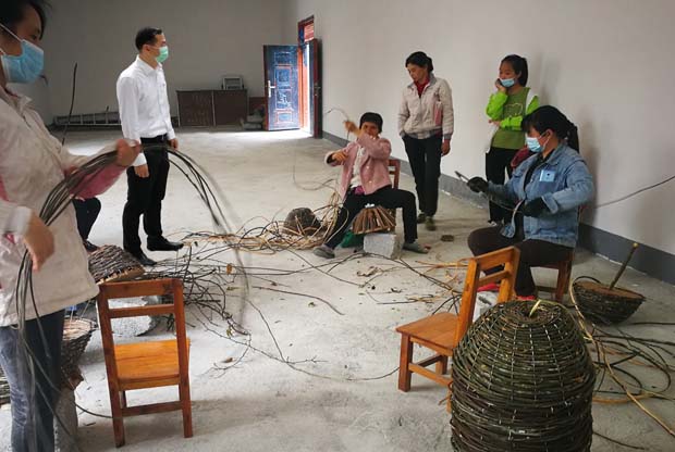 肖凌在了解龍琴村留守婦女藤編花籃項目情況