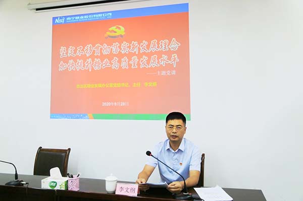 2020年9月28日下午,自治區糖業發展辦公室黨組書記、主任李文綱來到南寧糖業,為公司黨員上了一堂主題黨課——《堅定不移貫徹落實新發展理念 加快提升糖業高質量發展水平》。本次主題黨課由南寧糖業黨委書記、董事長莫菲城主持,自治區糖業發展辦公室機關黨支部黨員和南寧糖業公司本部第一、第二黨支部黨員約80人參加。